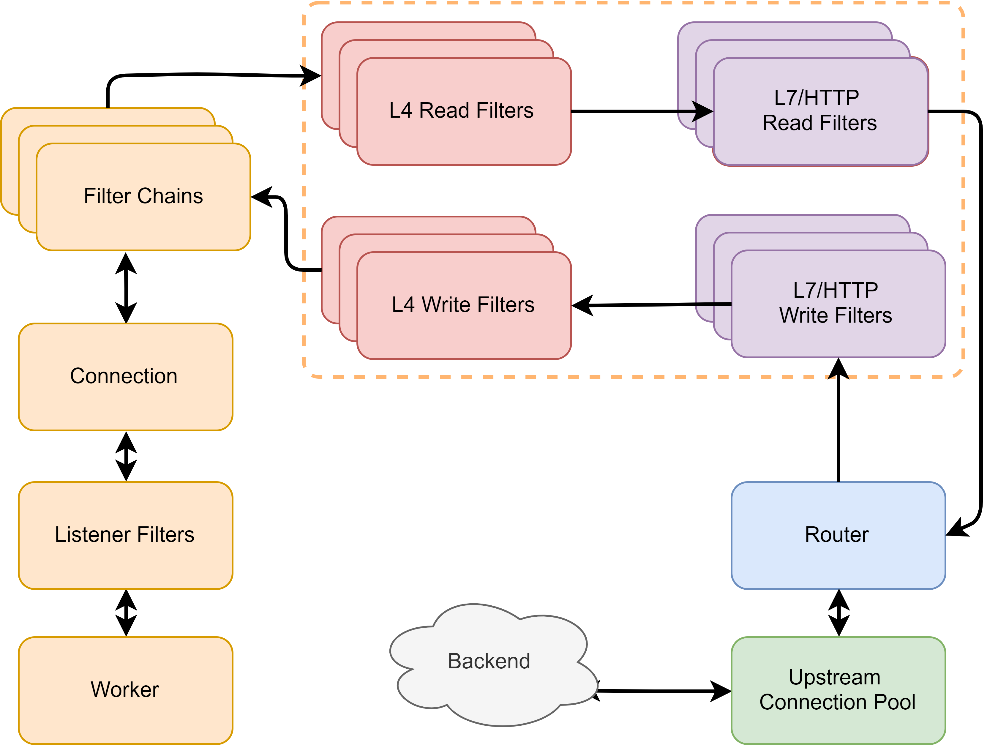 As can be seen from the above figure, such a request processing structure is very close to the design idea of the F5 TMOS system, and is similar to NGINX to a certain extent. Connections and requests correspond to different processing components at different protocol levels and stages, and these components are themselves extensible and programmable, which in turn enables flexible programming control of the data flow.