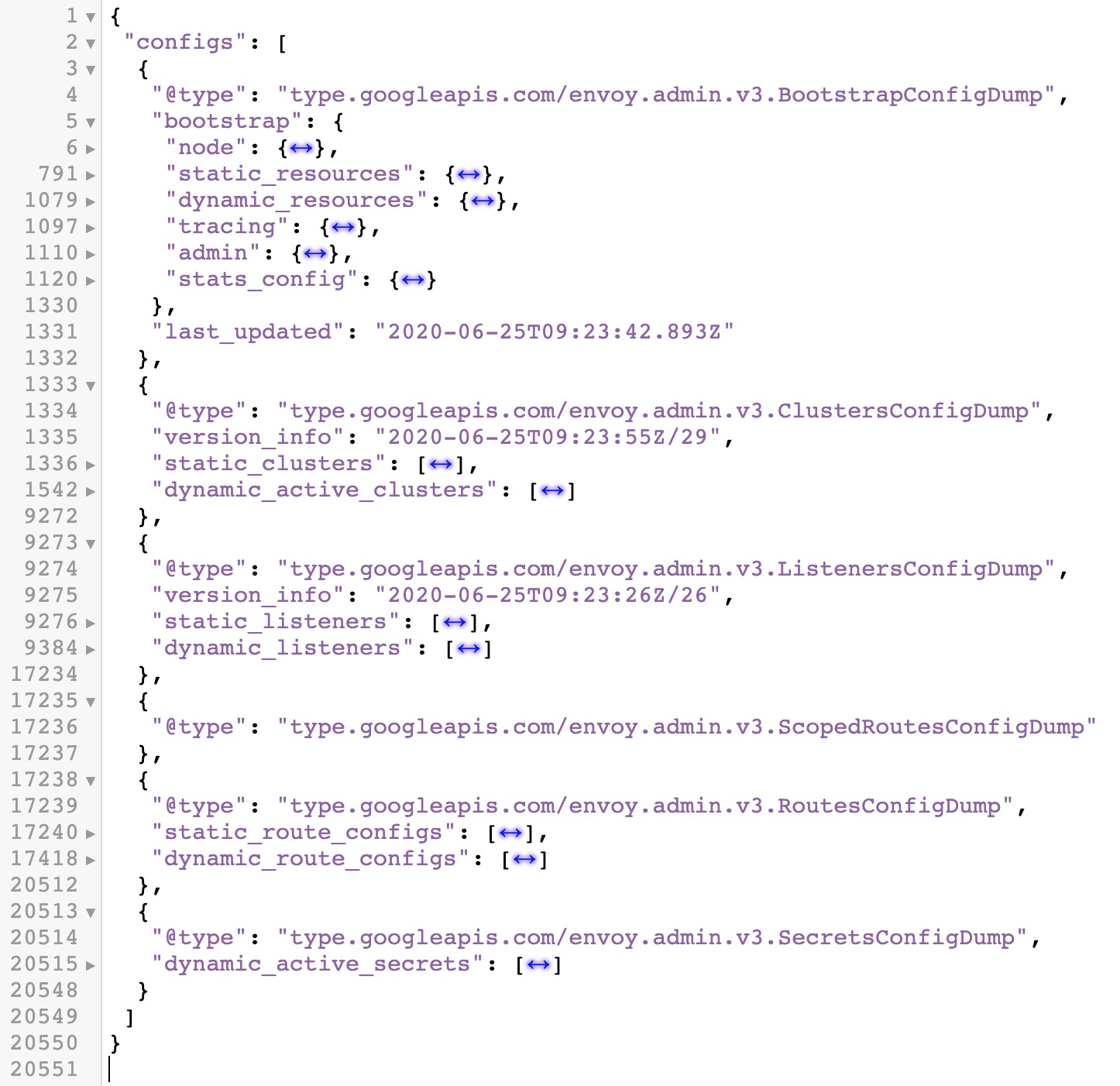 In the envoy overall configuration dump of the following figure, you can see that the contents of bootstrap and other static and dynamic configurations are included: