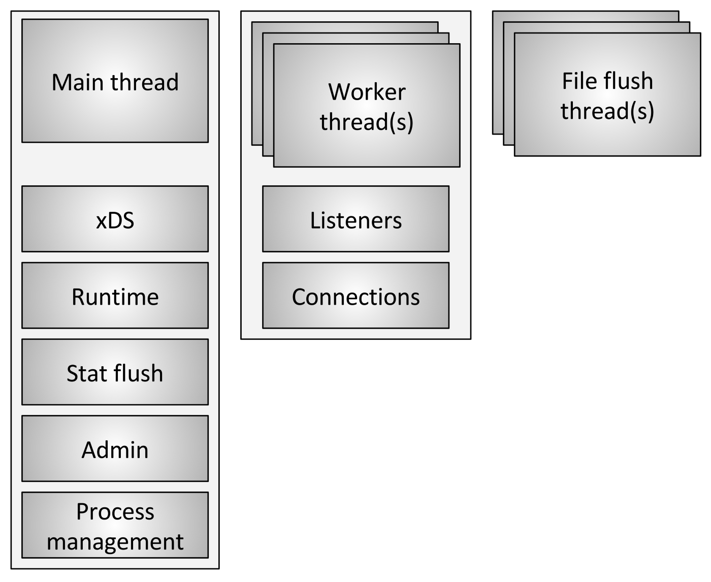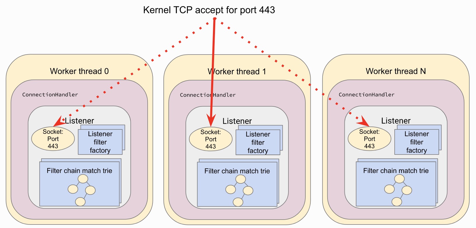Similar to NGINX, Envoy is an asynchronous, non-blocking design, using an event-driven approach. Each thread is responsible for each listener, SO_REUSEPORT can also be used to share sockets, NGINX also has a similar mechanism.