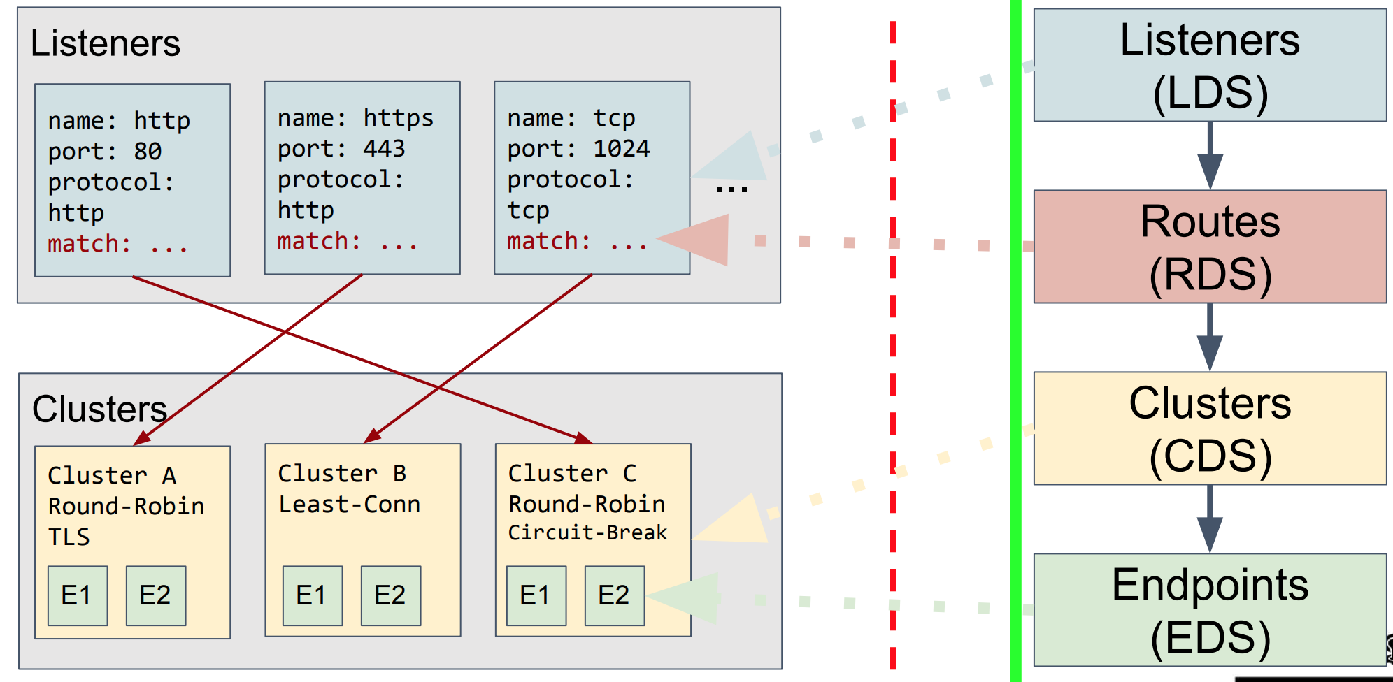 Combined with the following figure, you can see the basic Envoy configuration structure and its logic, whether it is an entrance listener (similar to F5’s VS and part of the profile configuration, NGINX’s listener and some Server paragraph configuration) or routing control logic (similar to F5 LTM policy, NGINX’s Various Locations matching, etc., or Clusters (similar to F5 pool, NGINX upstream), Endpoints (similar to F5 pool member, NGINX upstream server), and even SSL certificates can be automatically discovered from the service side through the interface