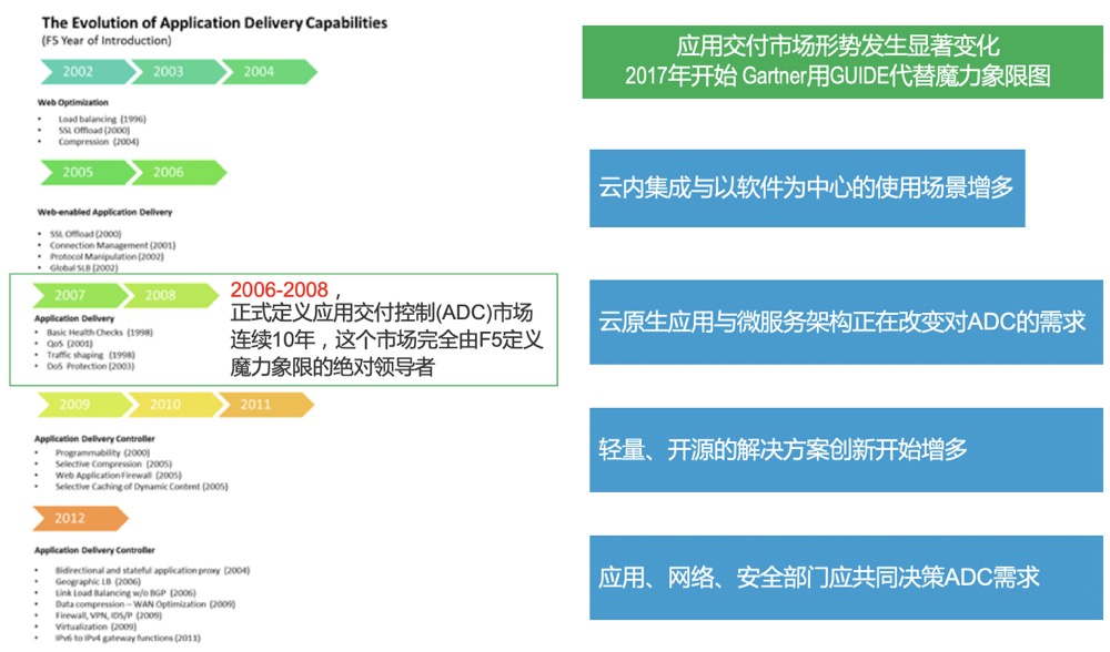 Under the microservices architecture, many problems have become how to control the communication and traffic insights between services. This is a typical application delivery field. As a frontier in this field, on the one hand, we must actively embrace and adapt to the new era of application architecture. On the one hand Need to innovate and continue to lead new directions. There have been two technological innovations in this field in history. The first was around 2006, when the topic of “load balancing was dead” was fired. The essence was that the market began to change at that time, and everyone was no longer satisfied with simple loads. Balanced, demand is derived from more complex scenarios such as application security, network optimization, application optimization, access control, and flow control. The concept of application delivery began to be proposed. It can be said that before 2006, the main concepts and technical directions of the market were based on The four-layer switch is the core concept of load balancing technology. Most players are traditional network manufacturers. The thinking and concepts are based on network switching. F5 is like a strange guy. The product design thinking is completely on another dimension. The TMOS V9 operating system, which has been released since 2004, has led the market since then, and no one has surpassed it for 10 years thereafter. The second technological innovation occurred around 2016. Affected by the cloud and microservices, software and lightweight became the mainstream of the market. At the same time, Devops thought means that the role of users has changed. The traditional design for network operation and maintenance personnel It began to become difficult to meet market demand. The field dominated by F5 has also undergone new changes in the market. Gartner no longer publishes magic quadrant analysis in the field of application delivery, and instead forms guidance in the way of Guide.