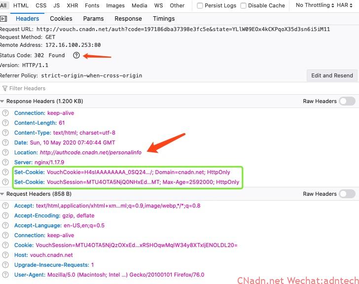 After the callback interface of vouch.imesh.club is accessed, it will drive vouch to initiate access_token acquisition on the server side. At this time, the browser cannot capture it. When vouch has been obtained on the server, it returns a 302 to the browser again. This 302 requires the browser to officially access the application address, and is accompanied by the relevant cookie to the client browser: